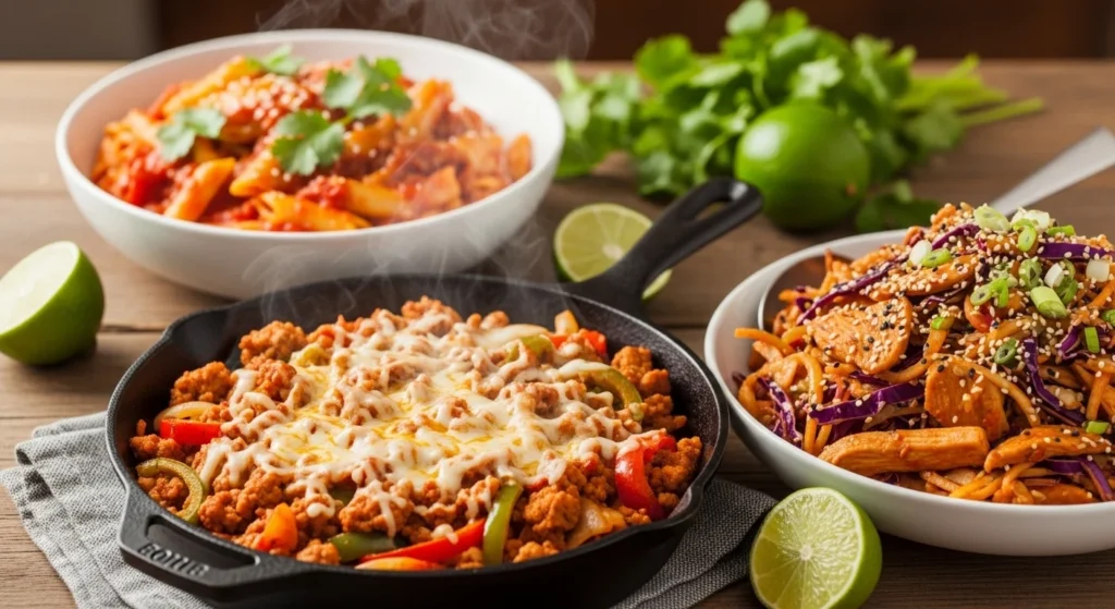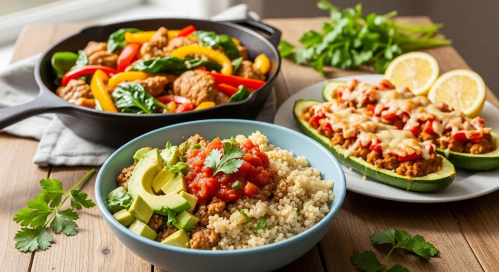 Introduction Healthy ground turkey dinners don’t have to feel boring. With 93% lean turkey for moisture, veggie-packed skillets, protein bowls, and stuffed vegetables, you can get a comforting meal on the table in under 30 minutes. These recipes lean on nutrient-dense add-ins like quinoa, zucchini, cabbage, and fire-roasted tomatoes—perfect for meal prep, busy nights, and anyone who wants flavor-first healthy food. 1. Quinoa Turkey Taco Bowls (Black Beans + Fire-Roasted Tomatoes) This bowl is a healthy dinner template you can repeat all year without getting bored. Quinoa adds protein and fiber, black beans make it filling, and fire-roasted tomatoes bring … Read more