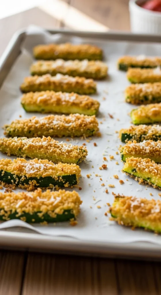 Crispy panko parmesan zucchini spears create a crunchy baked vegetable that feels similar to oven fries. The breadcrumb coating forms a crisp crust while the zucchini inside becomes tender and flavorful. Baking at high heat helps the coating brown without frying, making this recipe both comforting and simple.
