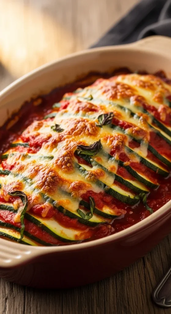 Marinara parmesan baked zucchini combines roasted vegetables with rich tomato sauce and melted cheese. The zucchini softens while baking and absorbs the flavor of the marinara. Parmesan melts on top and forms a savory crust during the final minutes of cooking. This dish feels similar to a vegetable version of baked pasta.