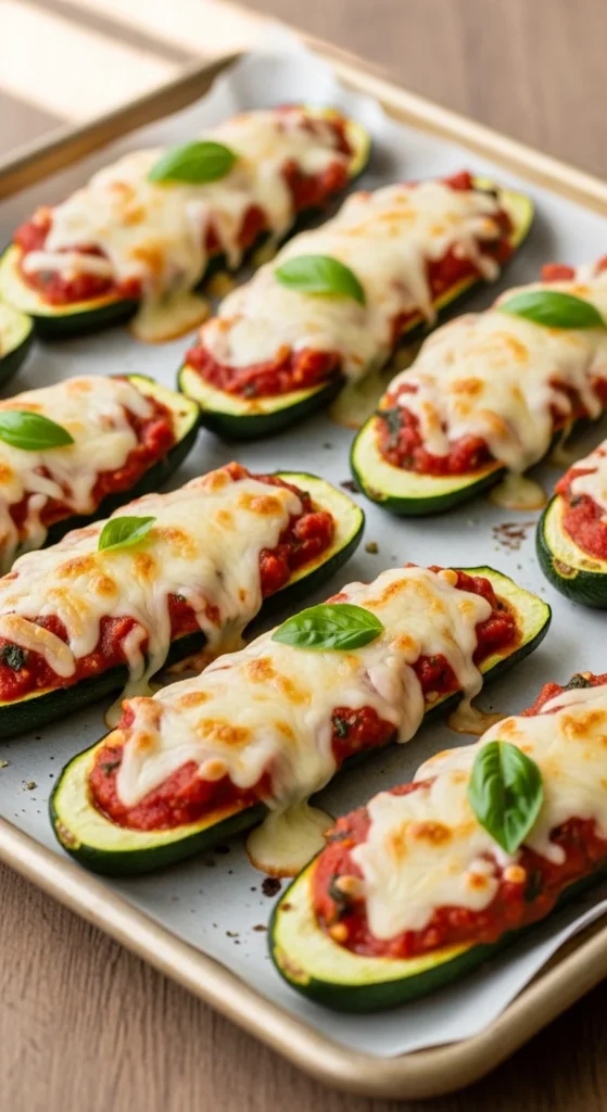 Zucchini boats filled with marinara and mozzarella create a baked vegetable dish that resembles a lighter lasagna. The zucchini halves hold the sauce and cheese while roasting until tender. Melted mozzarella bubbles on top and forms a golden layer during the final minutes of baking.