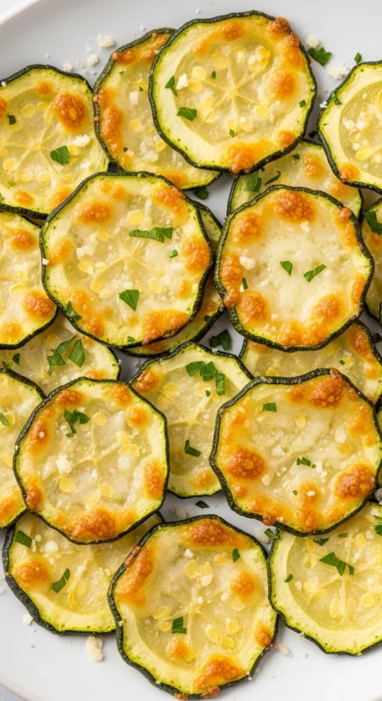 Cheesy baked zucchini chips transform thin zucchini slices into crunchy snacks. The parmesan melts during baking and forms a golden crust around the edges of each slice.