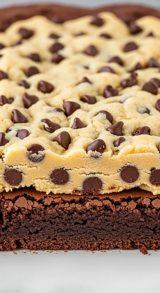 Layer cookie dough over brownie batter and bake 30–32 minutes at 350°F.