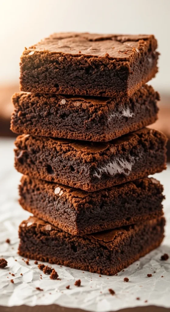 These brownies keep the same fudgy goals but use dairy-free fats. The texture stays dense because flour stays low and there’s no leavening. Coconut oil or neutral oil keeps moisture locked in. Ribbon-stage beating creates shine. Figure-8 folding keeps batter thick. Short bake keeps center soft. Great for sharing with mixed diets.