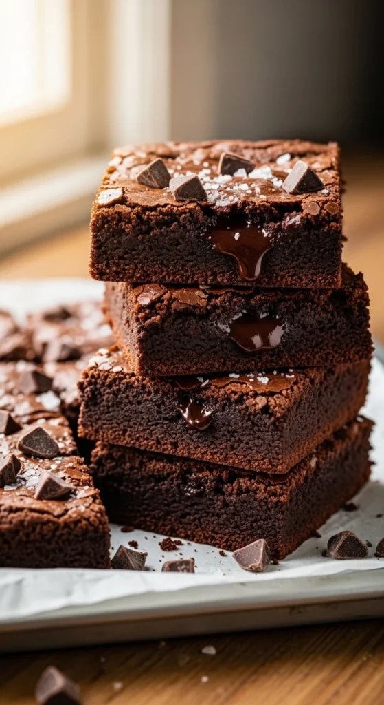 This recipe focuses on when salt goes in for best flavor. Salt mixed into the egg base helps the chocolate taste fuller. Melted chocolate and cocoa keep flavor strong, while the fat blend prevents dryness. Low flour keeps the texture dense and smooth. Quick ribbon-stage beating creates shine. A short bake keeps the center soft. A final pinch of flaky salt gives contrast.