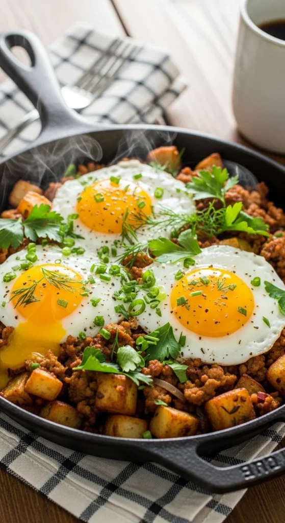 Serve warm directly from the skillet. Fresh basil or parsley adds brightness. Pair with a green salad. The dish reheats well for lunches.