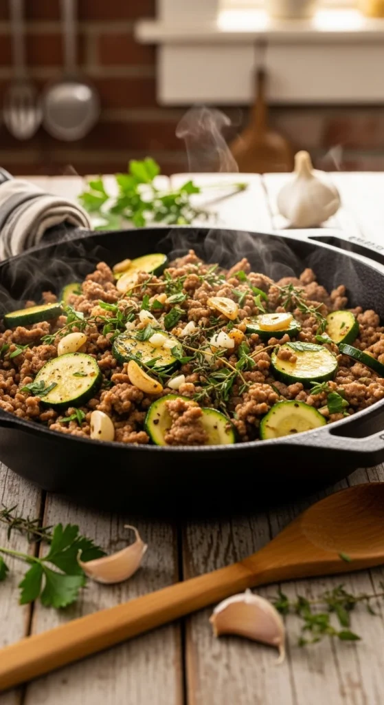 This one-pan turkey zucchini skillet is simple, comforting, and quick. The zucchini absorbs the savory turkey juices while staying tender. Everything cooks in one pan, making cleanup easy.
