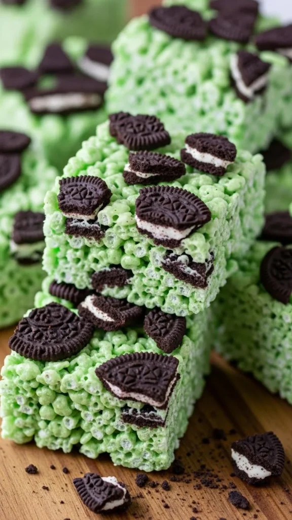 These treats mix classic marshmallow chew with cookie crunch. Crushed chocolate sandwich cookies add rich flavor and a fun speckled look against the green base. The texture stays gooey with little crunchy pockets. Kids love the cookie pieces. Great for party trays that want something bold. Easy to make with pantry staples.