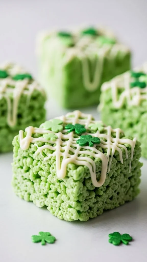 These treats are bright, playful, and perfect for kids’ parties. The green base feels festive, and the colorful marshmallow shapes add a fun top layer. The texture is chewy with pops of crunchy cereal and soft marshmallow bits. They’re easy to make in big batches. Great for St Patrick’s Day celebrations and classroom snacks. The look is cheerful without extra decorating.