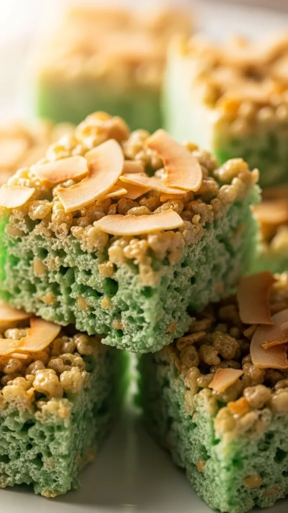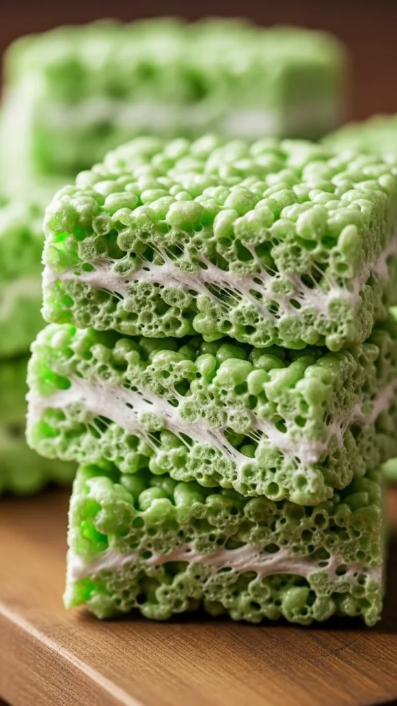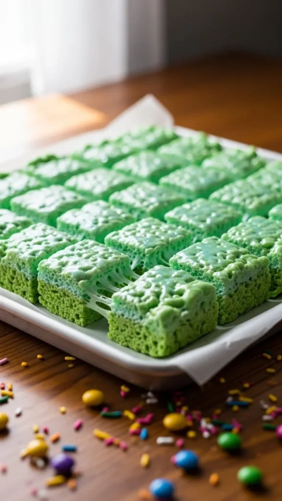 Cut into squares with a warm knife for clean edges. Top with a tiny pinch of green sanding sugar for sparkle. Stack on a white platter so the green pops. For parties, add cupcake liners under each square for easy grabbing. Store covered at room temperature to keep them soft. Serve within 2 days for the best chew.