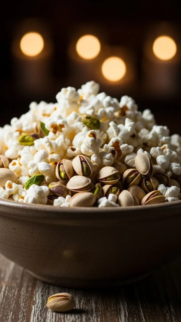 This popcorn mix stays light while delivering crunch. Pistachios add richness without overpowering the popcorn. It’s easy to snack on for long periods.