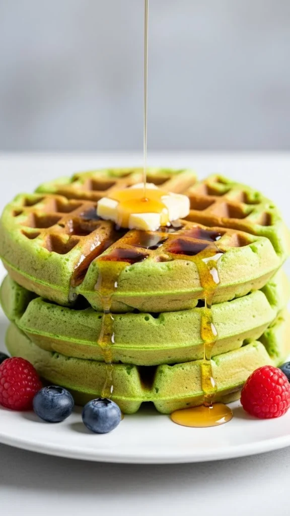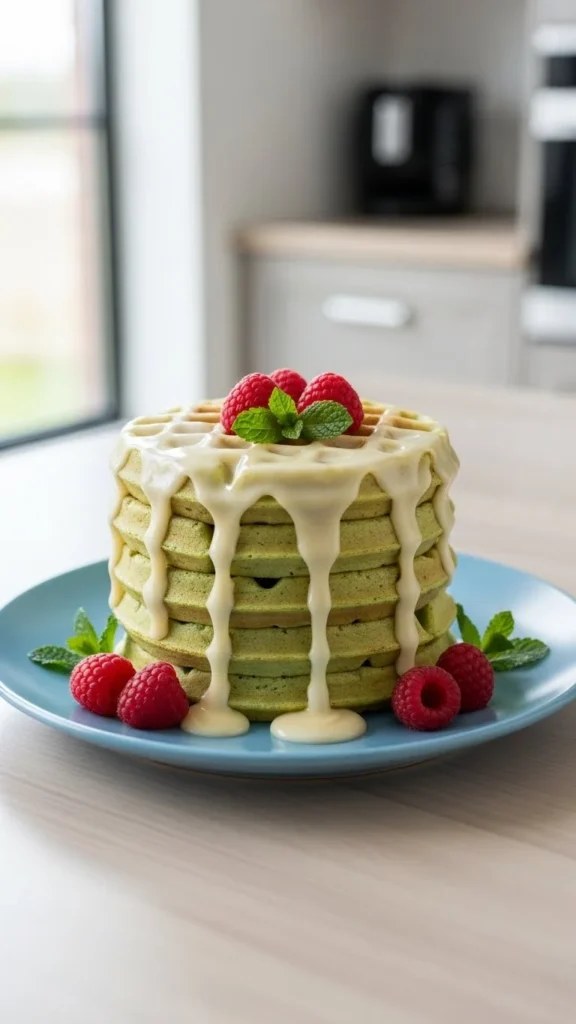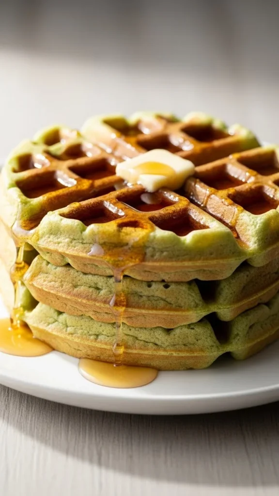 These waffles use pistachio pudding mix for color and softness. The flavor is sweet and familiar, making them an instant kid favorite.