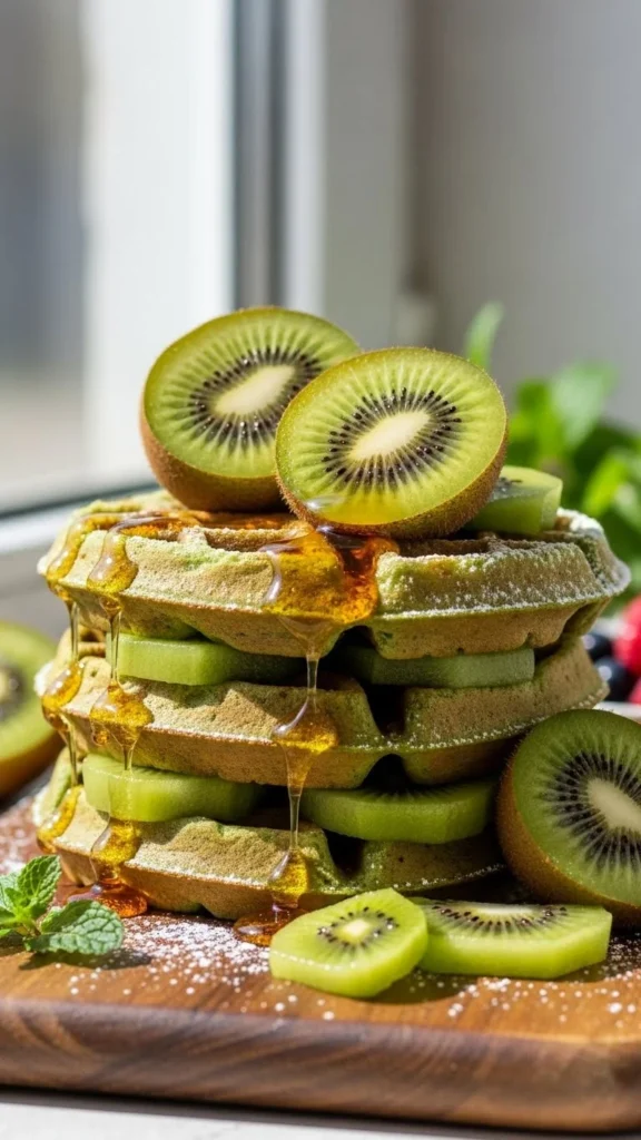 These waffles use blended kiwi and yogurt for a soft texture and fun color. The flavor stays light and refreshing, making them great for warm mornings.