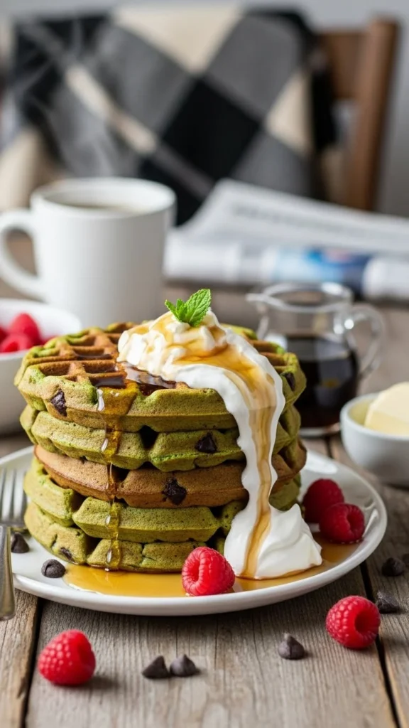 Soft mint flavor and chocolate chips make these waffles feel like a treat while staying kid-friendly.