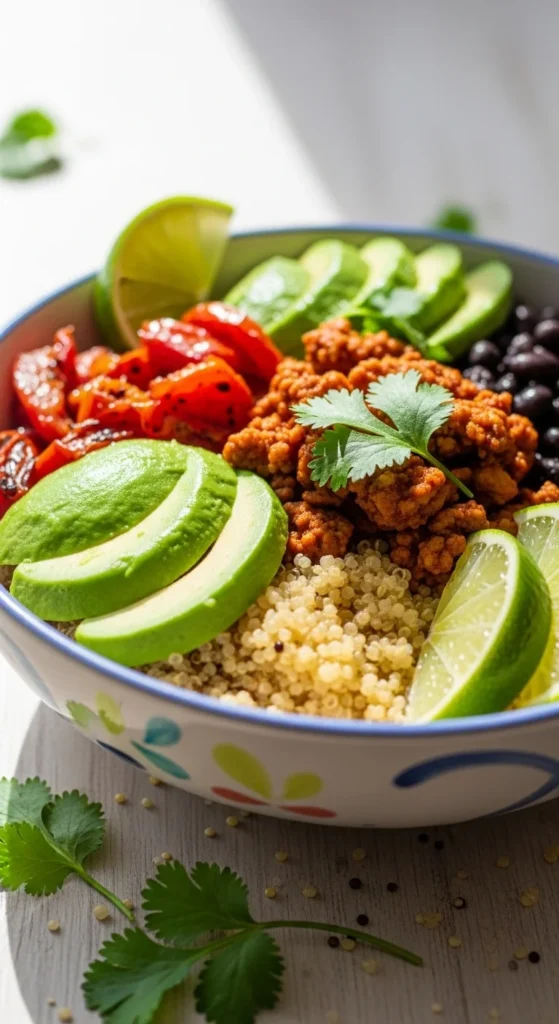 This bowl is a healthy dinner template you can repeat all year without getting bored. Quinoa adds protein and fiber, black beans make it filling, and fire-roasted tomatoes bring smoky depth fast. Turkey stays juicy when you use 93% lean and finish with salsa or lime. Everything is meal-prep friendly and keeps well for lunches. The toppings let everyone customize without extra cooking. It tastes like taco night, just more balanced.