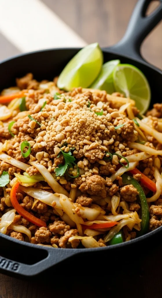 This skillet keeps things healthy while still feeling comforting and rich. Cabbage adds crunch and volume, and turkey brings protein. A peanut-lime sauce makes it taste satisfying with only a small amount. It cooks quickly and uses coleslaw mix for speed. Great for meal prep and reheating. It’s a fun twist from the usual soy-ginger version. Perfect for busy nights.