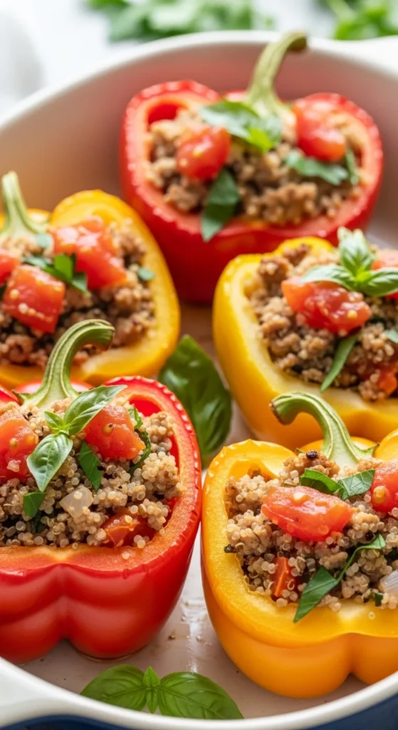 Stuffed peppers feel comforting and filling while staying nutrient-dense. This version skips cheese and uses quinoa for extra protein and fiber. Fire-roasted tomatoes add depth without extra effort. Turkey stays moist when you use 93% lean and don’t overbake. It’s great for meal prep because peppers reheat well. You can make a batch and eat all week. It looks impressive but is very simple.