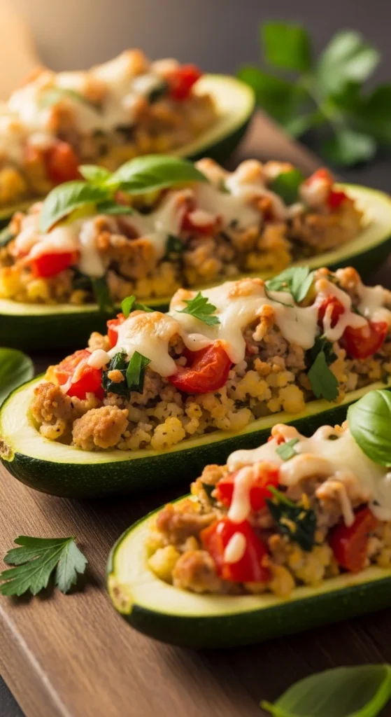 4. Fill zucchini and bake 18–22 minutes.