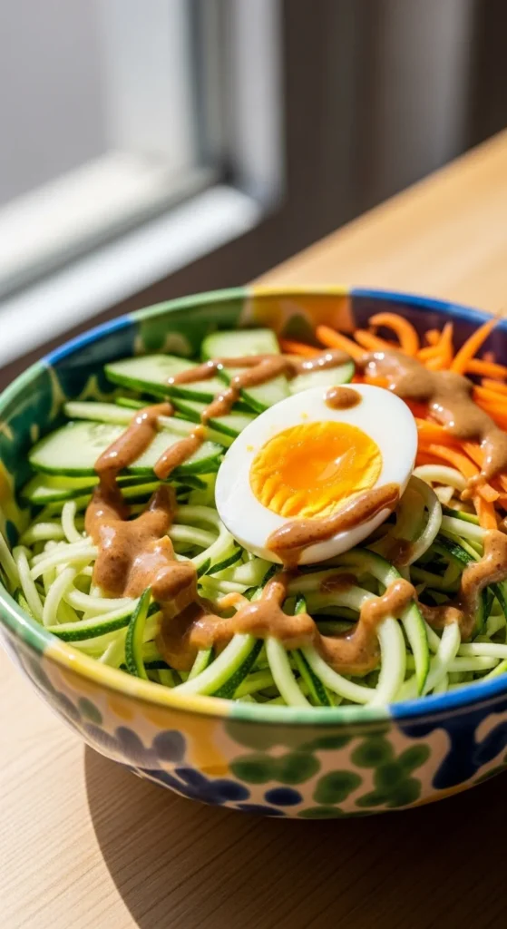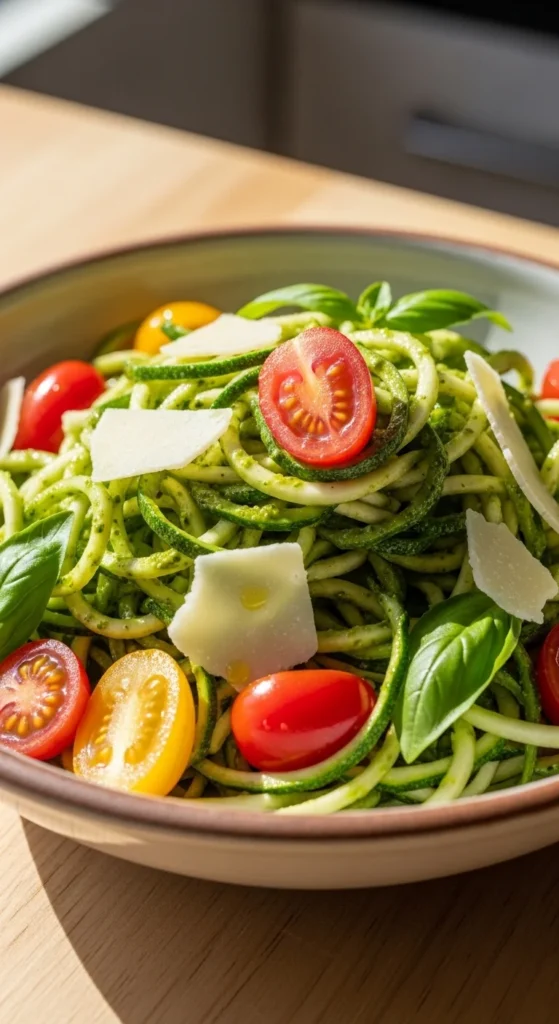 This bowl is a favorite because it feels like pasta without the heaviness. Zoodles cook in minutes, so dinner comes together fast. Pesto brings bold flavor and healthy fats that make the meal feel satisfying. Cherry tomatoes add freshness and color, and a little Parmesan gives a savory finish. The key is barely cooking the zoodles so they stay firm. It’s easy to add chicken or shrimp if you want more protein. Perfect for quick lunches and busy nights.