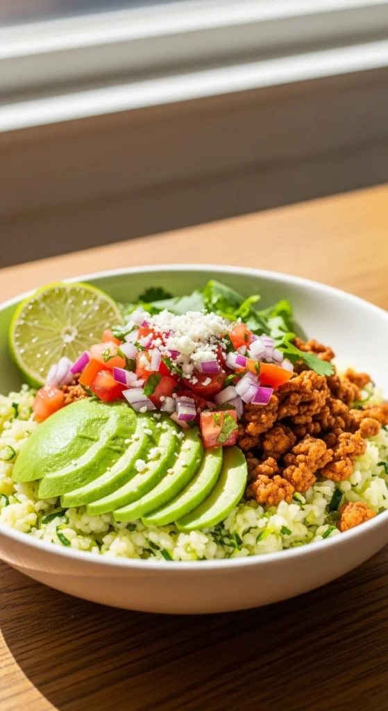 This bowl is great for macro tracking because you can portion each component easily. Zucchini rice keeps it lighter while still giving you a base. Salsa adds bold flavor without much effort. Add turkey, beans, or chicken depending on your goals. It’s fast and perfect for meal prep lunches. The best texture comes from cooking zucchini rice briefly so it stays fluffy. It’s a simple swap that still feels like a real bowl meal. Great for busy nights.