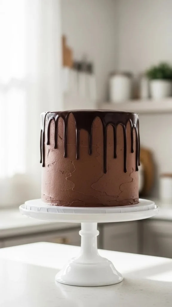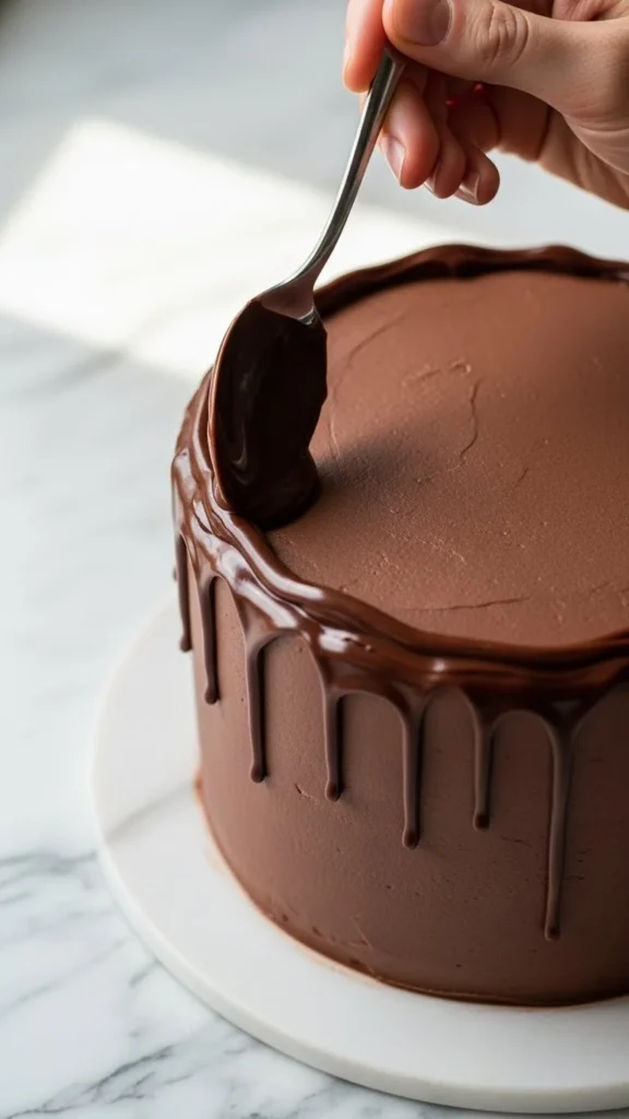 After frosting your cake, place it in the fridge for at least 30–45 minutes. The cold surface helps control the drip and prevents the chocolate from sliding all the way down.