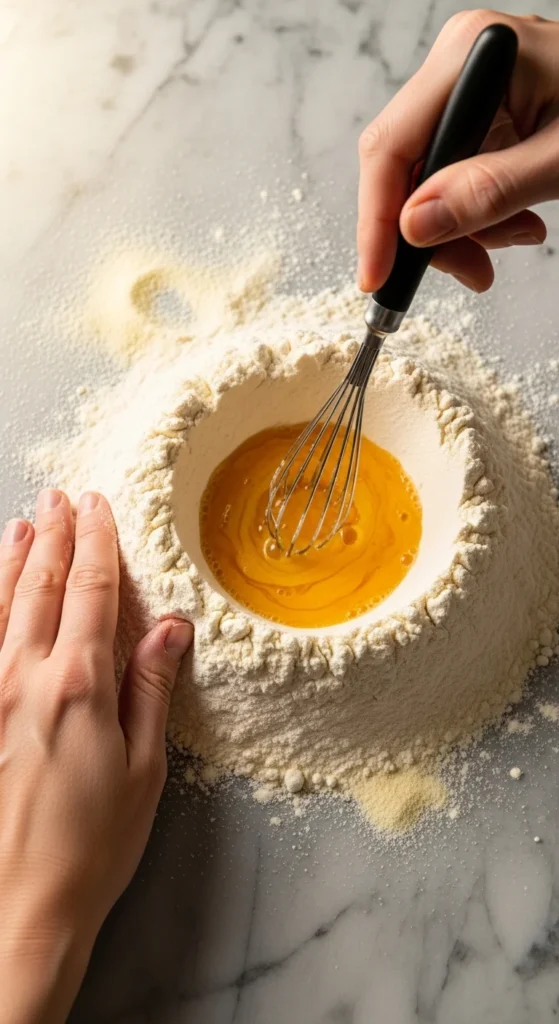 Pour flour directly onto your counter. Form a mound. Then make a deep crater in the center.