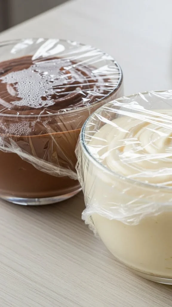 - Press plastic wrap directly onto the surface to prevent skin