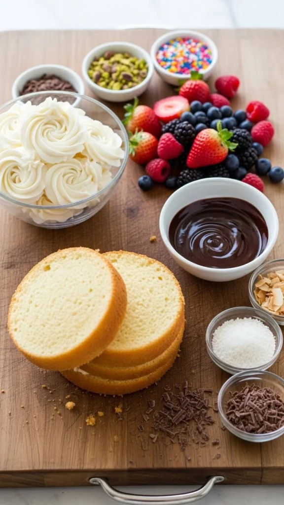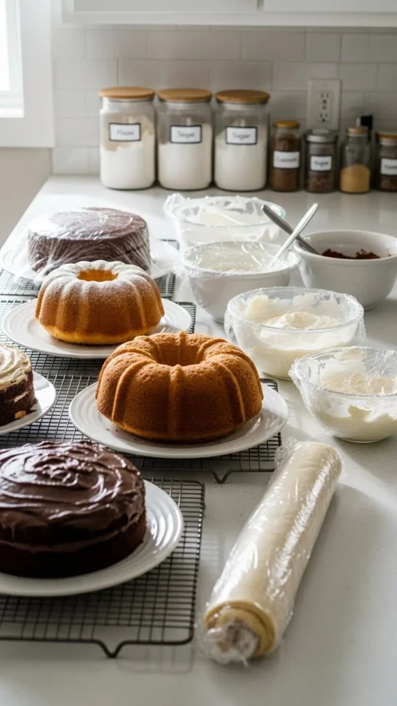 - Bake cake layers 1–2 days ahead