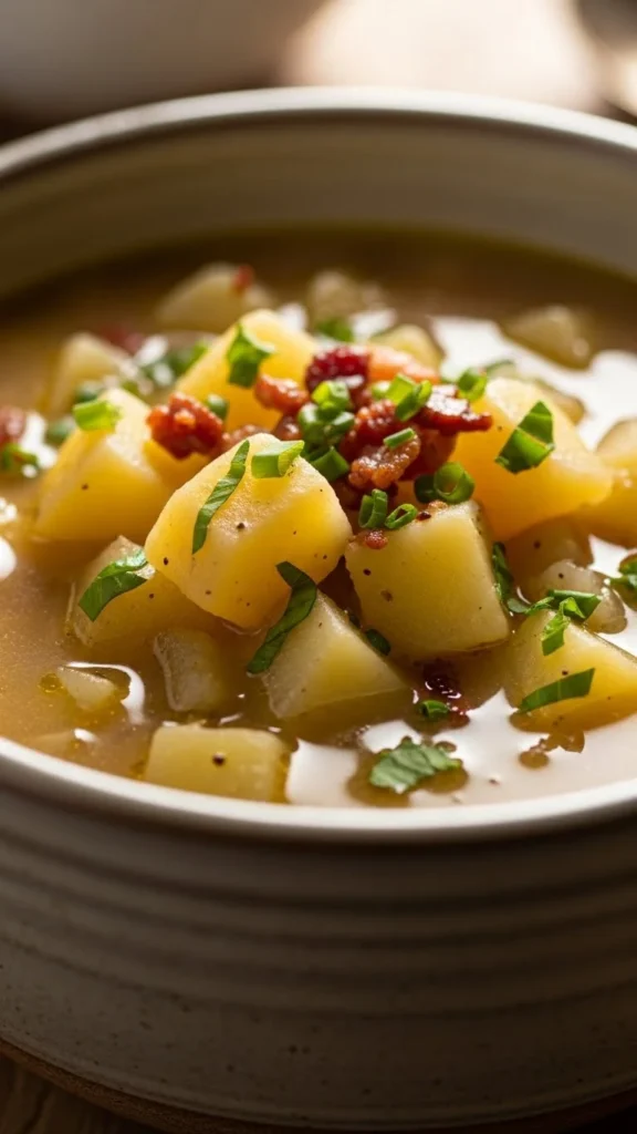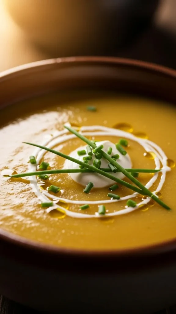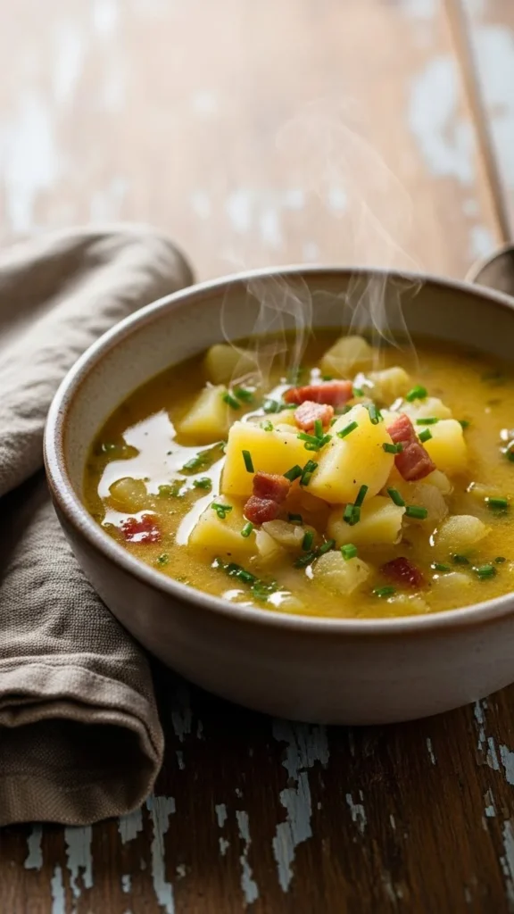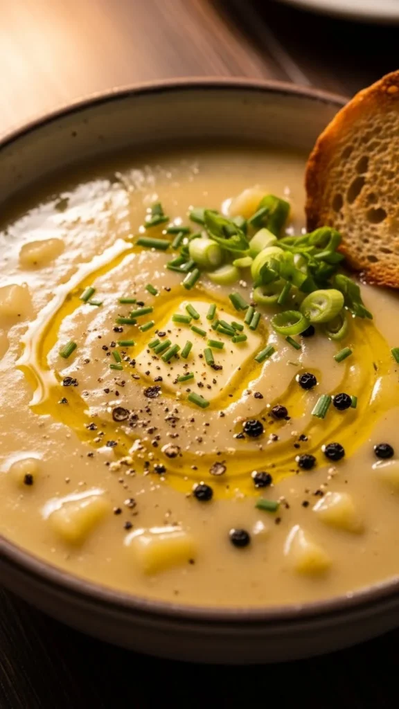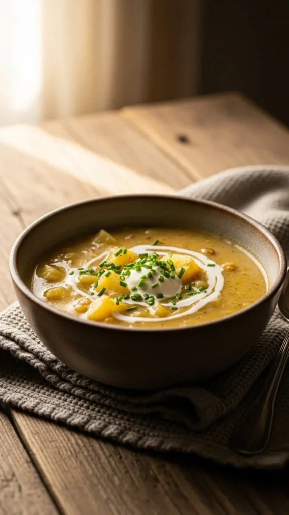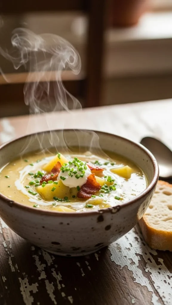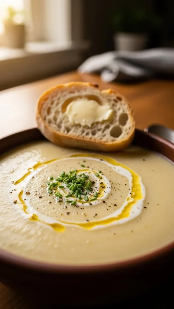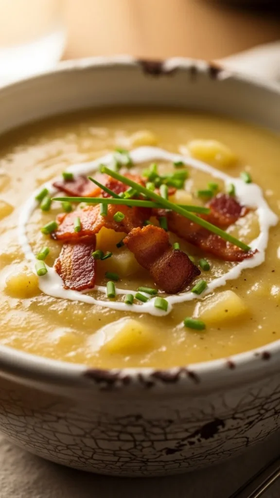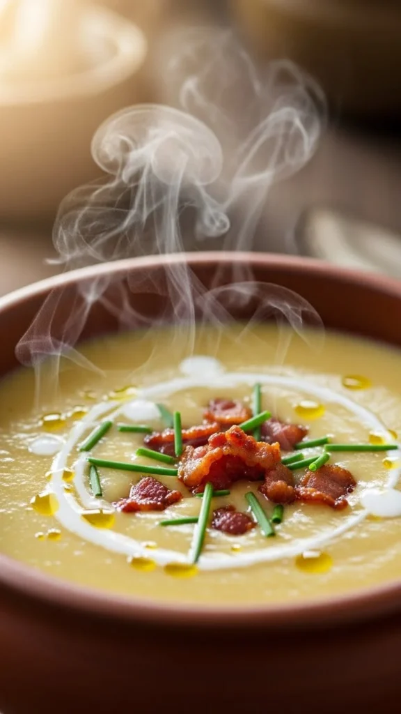 This traditional bowl focuses on softness and balance. Potatoes cook until tender and blend into a creamy base. Butter and cream add richness without overpowering the soup. Every spoonful feels familiar. A reliable comfort meal.
