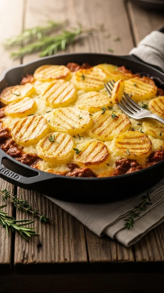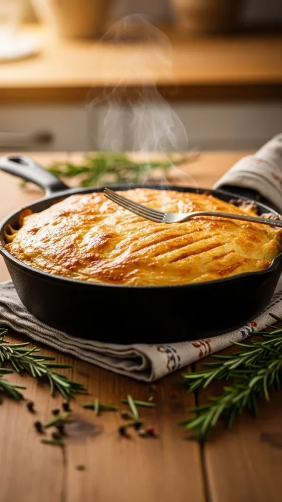 Skillet baking keeps everything simple. The filling stays juicy. Potato edges crisp lightly.