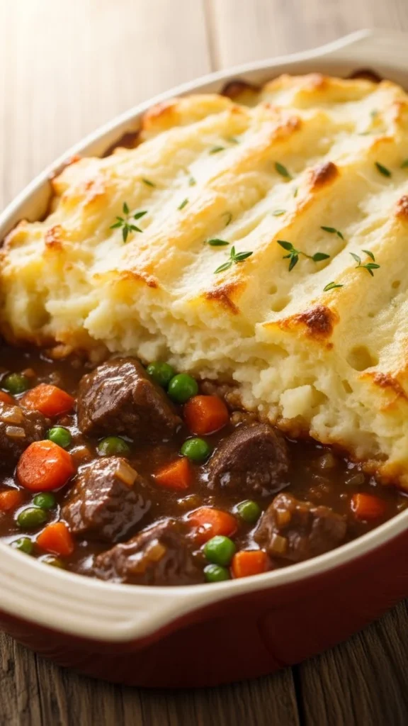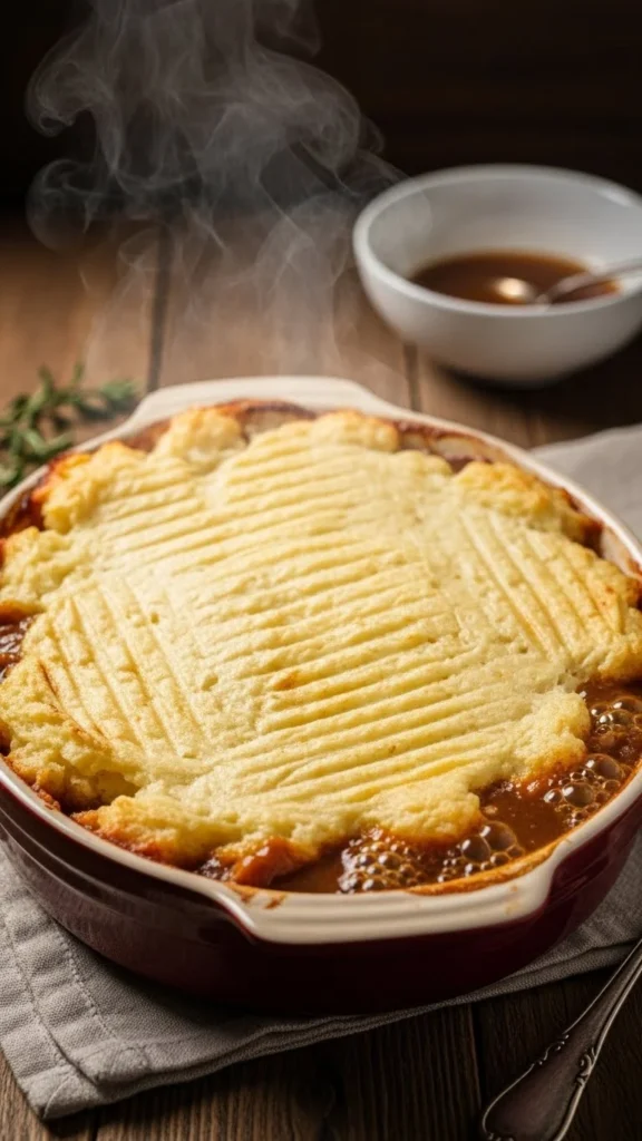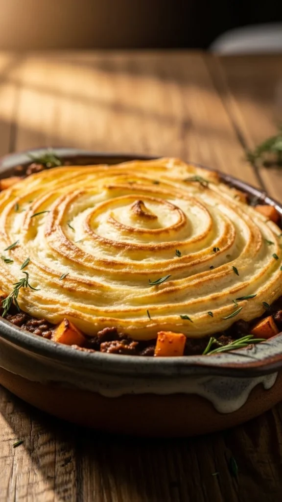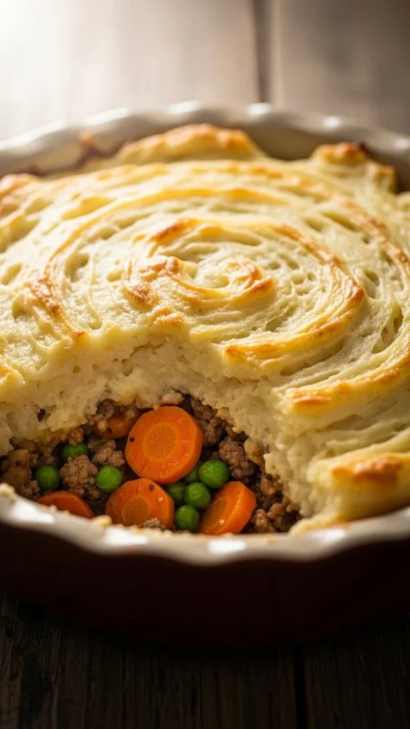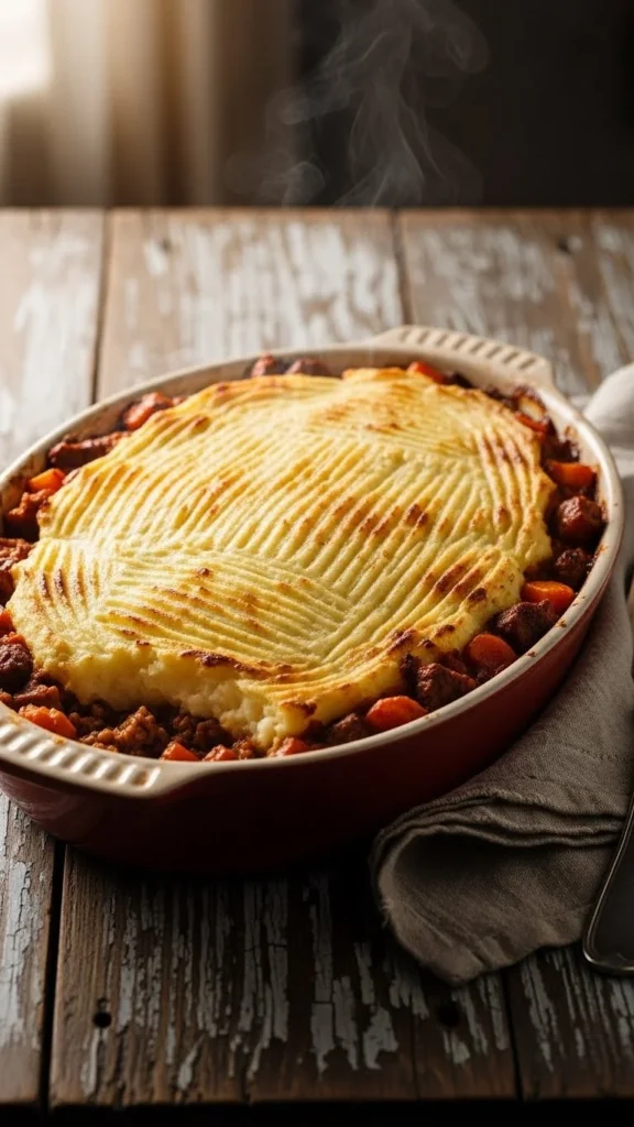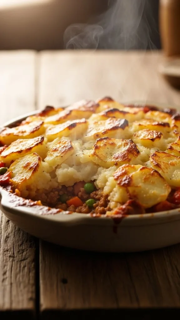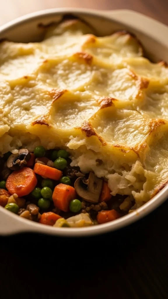 This version leans on root vegetables for a hearty, comforting base. The filling becomes thick and rich as it bakes. Mashed potatoes smooth everything together. It feels filling without being heavy. A solid option for cooler evenings.