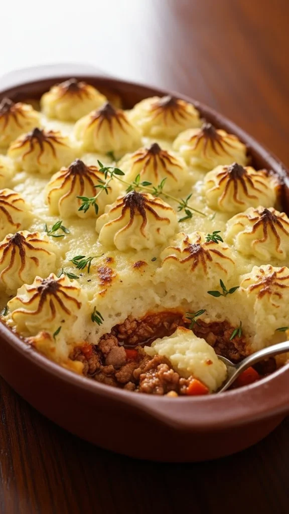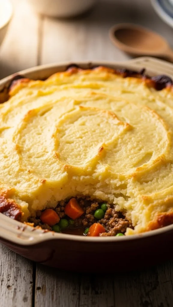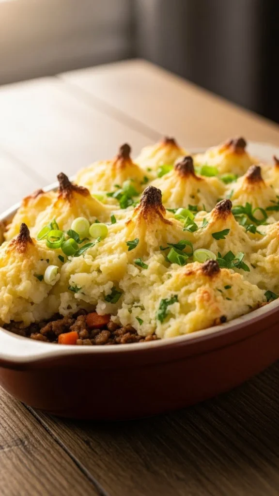 Colcannon-style potatoes bring cabbage and butter into the topping. The filling remains rich and hearty. The green flecks add texture and color. It feels traditional and cozy. Ideal for cooler nights.