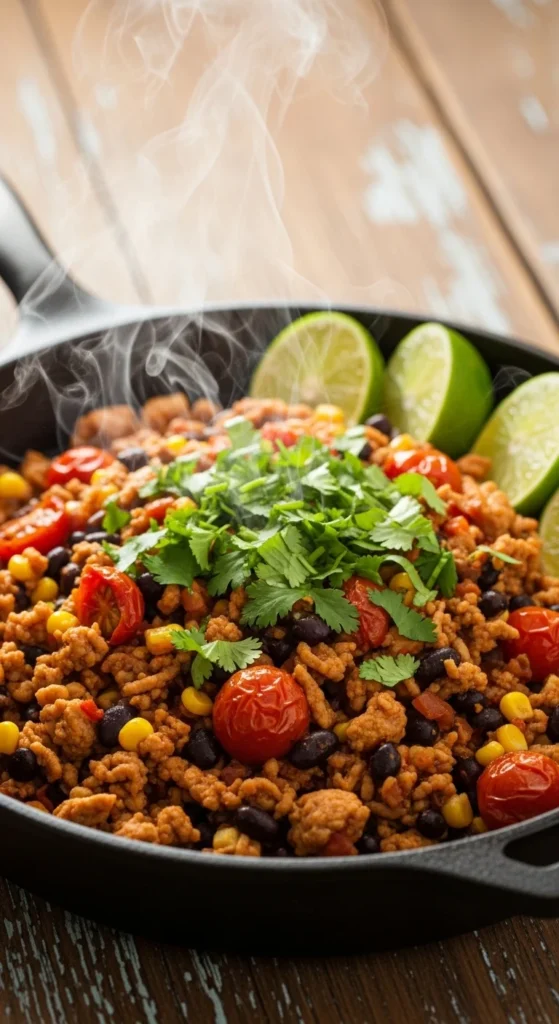 This taco skillet brings bold flavor while keeping dinner simple and quick. Ground turkey browns with onion and garlic to create a savory base, while cumin and chili powder give the dish a warm Mexican-style seasoning. Fire-roasted tomatoes add brightness and moisture so the skillet stays juicy without extra sauces. Black beans and corn provide texture and heartiness, turning this recipe into a full meal cooked in a single pan. It is perfect for busy evenings when you want something flavorful without a lot of dishes.