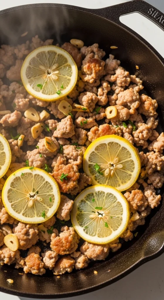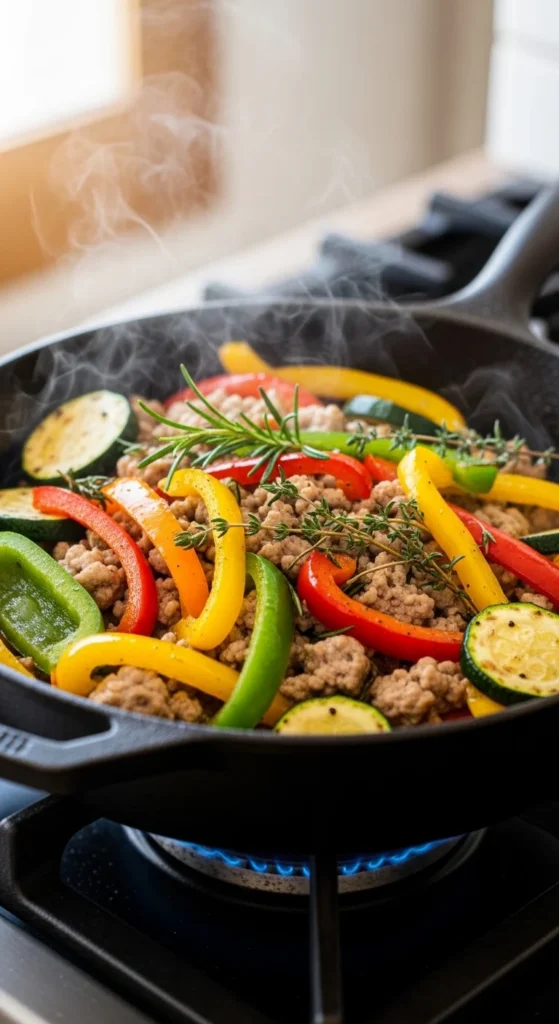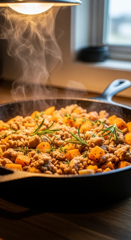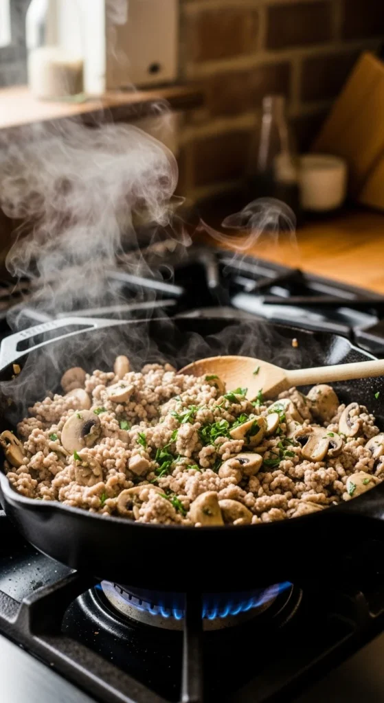 This skillet highlights the deep savory flavor that mushrooms bring to ground turkey. As the mushrooms cook, they release moisture that creates a light sauce around the turkey. Garlic and thyme add warmth while the mixture stays rich and comforting without heavy ingredients.