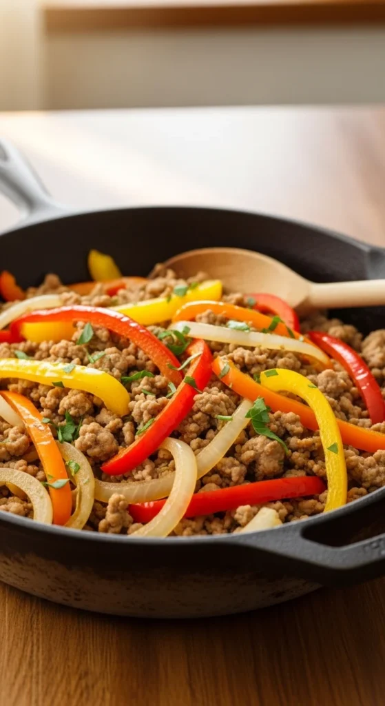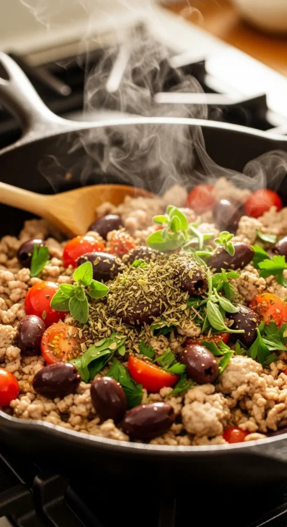 Mediterranean flavors pair wonderfully with ground turkey. This skillet uses tomatoes, olives, garlic, and oregano to create a savory mixture that feels bright and aromatic. Everything cooks together quickly, allowing the turkey to absorb the herbs and olive flavors.