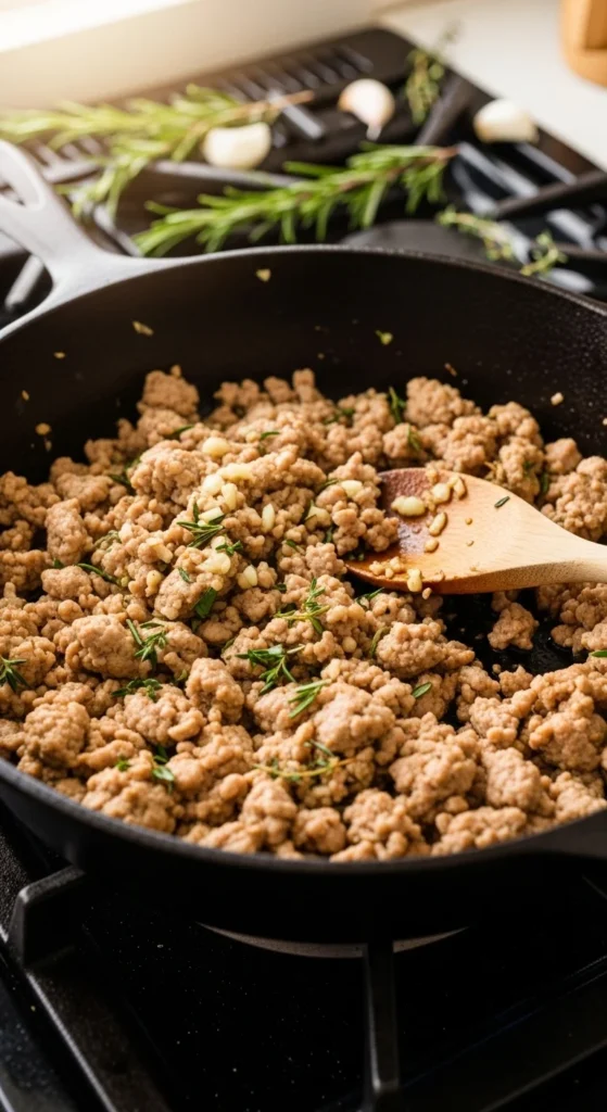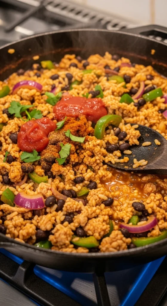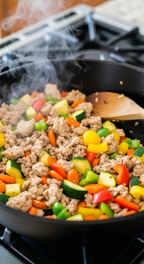 - Add ground turkey and cook 6–7 minutes until browned.