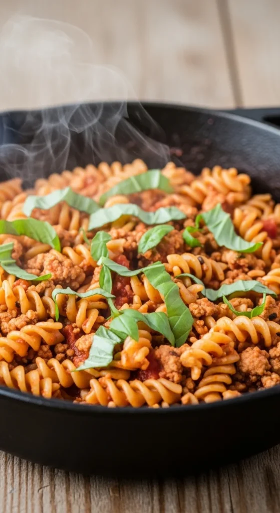 This pasta dish cooks directly in the sauce, which allows the noodles to absorb flavor as they soften. Ground turkey browns with garlic and onion before broth and marinara sauce are added to form a rich cooking liquid. As the rotini cooks, the starch released from the pasta thickens the sauce naturally, creating a creamy texture without extra cream. The result is a comforting meal that tastes like it simmered for hours even though it takes less than half an hour.