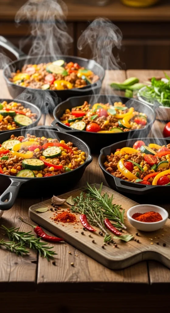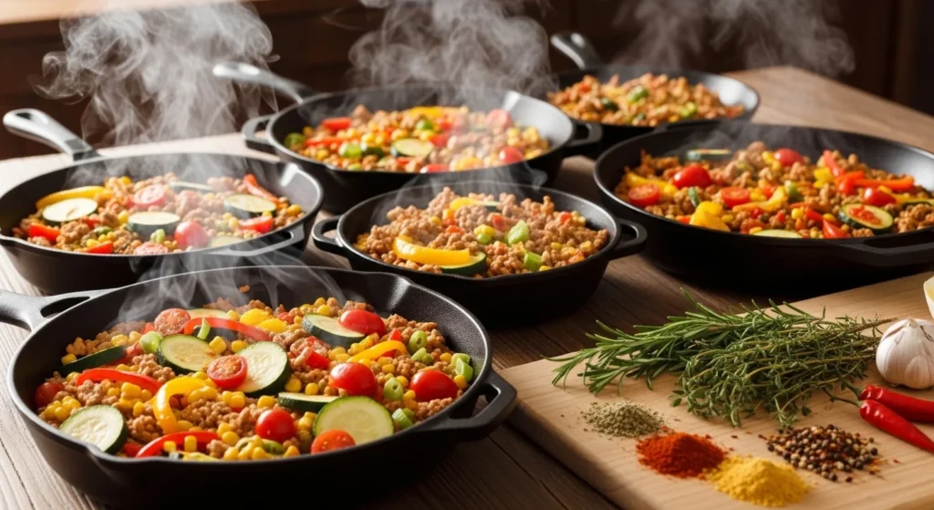 These recipes focus on hearty skillet meals that come together in around 20–30 minutes. From taco skillets and veggie-packed stir-fries to pasta and comfort-food classics, every recipe keeps preparation simple while delivering satisfying flavor.