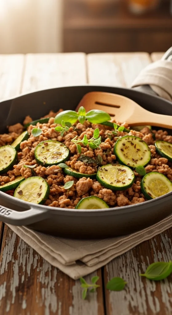 This summer skillet combines lean ground turkey with fresh zucchini for a light yet satisfying meal. Zucchini cooks quickly and releases moisture that helps create a natural sauce in the pan. Italian seasoning and garlic add classic Mediterranean flavor while the turkey provides protein and richness. The combination makes a balanced dish that feels comforting but still fresh and bright.