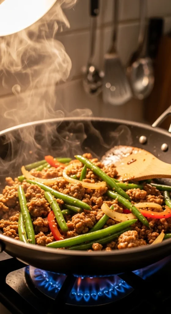 This stir fry brings bold Asian-inspired flavor to a simple turkey skillet. Garlic and ginger create a fragrant base while tamari and honey form a balanced savory glaze. Green beans stay crisp and vibrant while soaking up the sauce. A quick cornstarch mixture thickens the glaze so it coats the turkey and vegetables evenly.
