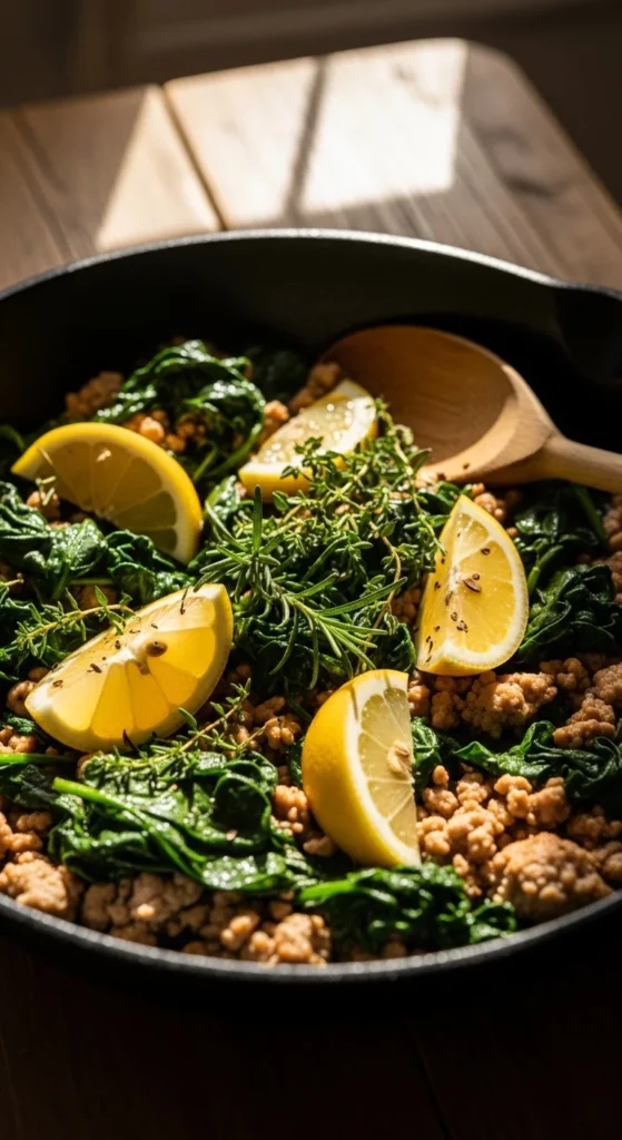 17. 15-Min Turkey “Greek” Skillet (Frozen Spinach + Lemon)