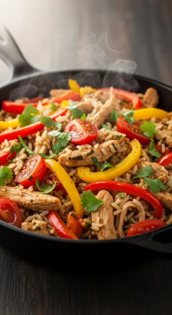 This tastes like stuffed peppers without turning on the oven. Frozen pepper strips save time and cook quickly. Turkey browns fast and absorbs seasoning. Add rice and jarred sauce, and you get a full meal in one skillet. It’s comforting and beginner-friendly. Great for leftovers and meal prep. Perfect for busy nights when you want a hearty dinner. Minimal cleanup.