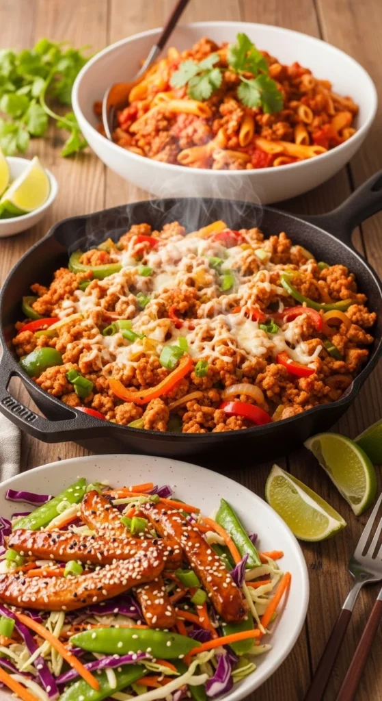 This is the strategy recipe that makes ultra-fast dinners repeatable. You cook turkey with a seasoning packet and a jarred sauce, then portion it into containers. Add frozen veggies directly to the skillet so everything cooks together. It’s perfect for meal prep because you can change the base—rice, quinoa, lettuce—without changing the turkey. It reheats well and stays juicy. Great for after-work exhaustion nights. One skillet, many meals.