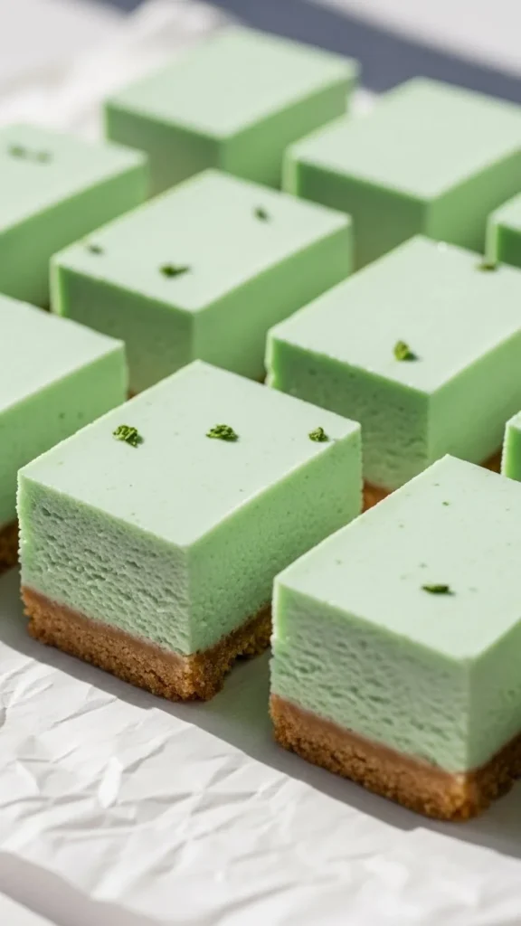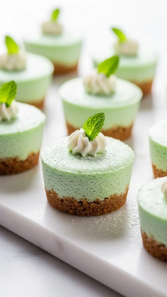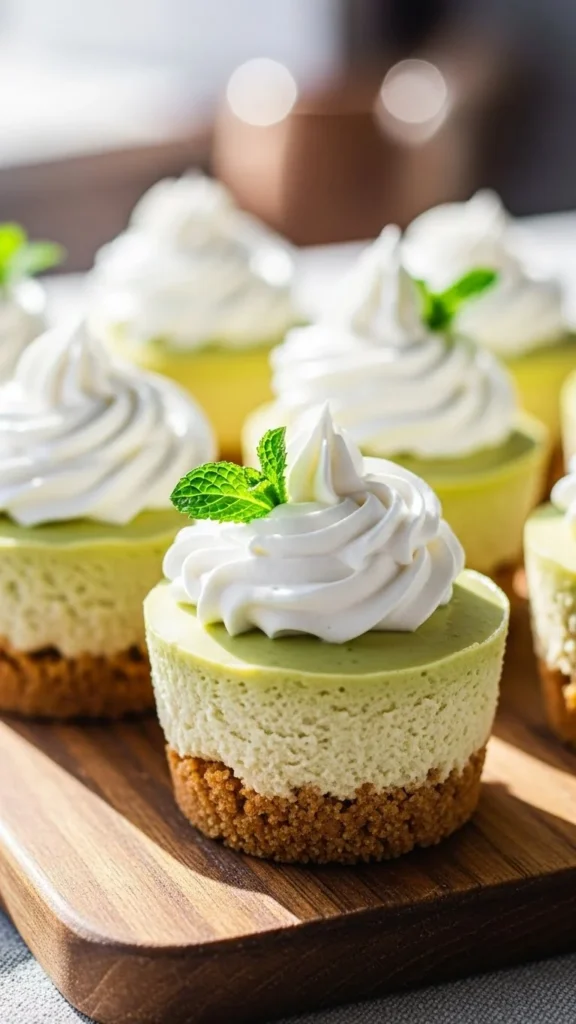 These mini cups are perfect for parties and easy portioning. The creamy filling stays smooth and rich. A green topping makes them festive. No slicing required. Kids love the individual servings.