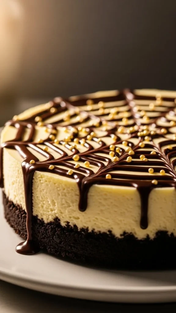 A cookie crust and chocolate drizzle make this feel like a “pot of gold” dessert. The filling stays rich and smooth with a sweet chocolate finish. It looks party-ready with gold sprinkles. A fun option for kids. Great for dessert tables.