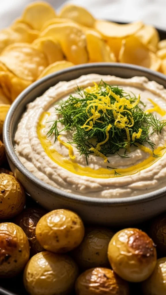 This dip tastes like a creamy potato salad dressing, but made for dipping. Lemon and dill keep it fresh and snappy, while the creamy base makes it comforting. It pairs especially well with potato chips and roasted baby potatoes. It’s also great as a sauce for grilled chicken. A fun Irish-style potato moment for the snack table.