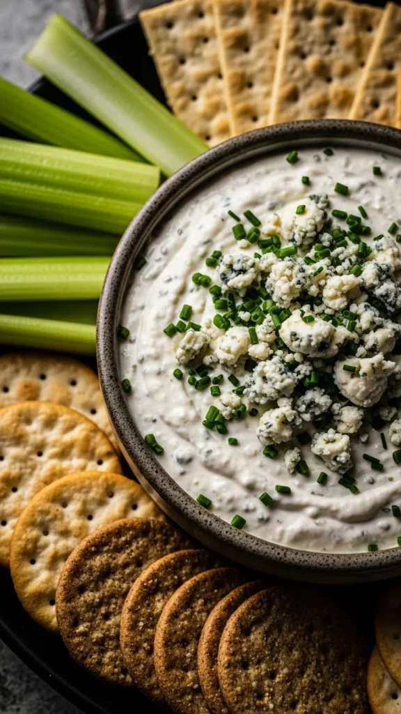 Serve with celery sticks, crackers, and pretzel crisps. Top with extra blue cheese crumbles for a bold look. Add sliced pears or apples on the side for a sweet contrast. Keep chilled and stir once before serving. If it’s too strong, add 2 tbsp sour cream.