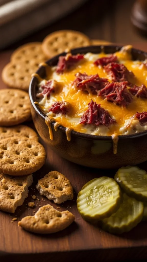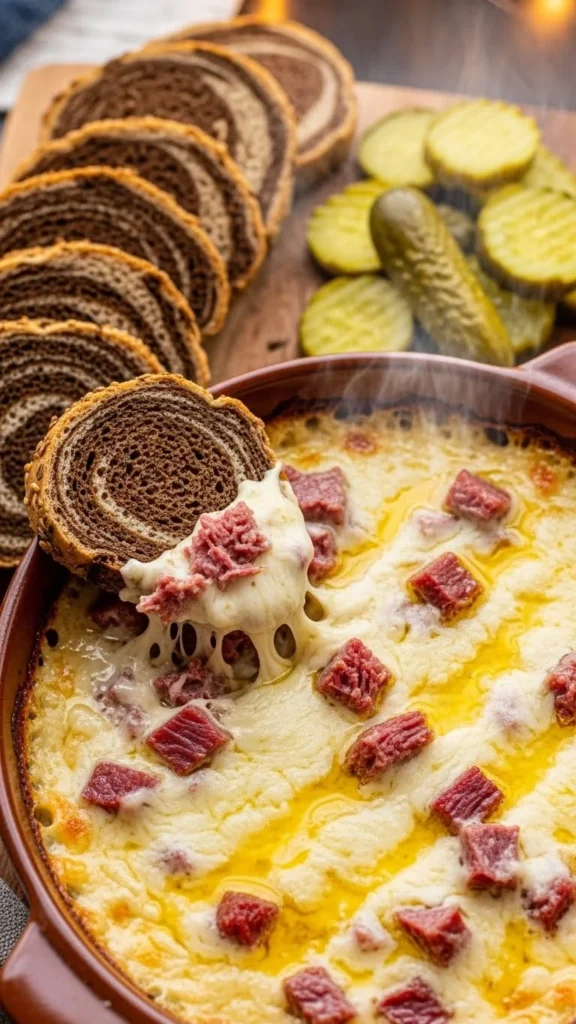 Serve warm with rye crackers, pretzel crisps, and bread cubes. Top with extra cheddar and a few corned beef bits. Add pickles on the side for tang. Rewarm if it cools so it stays scoopable. Keep portions smaller and refill to keep it hot.
