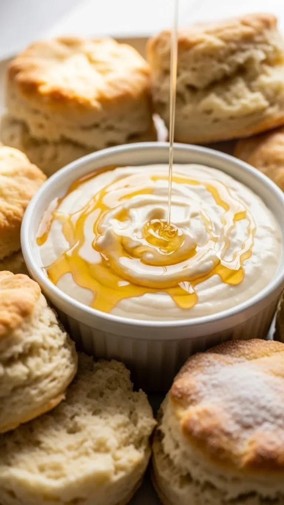 Serve with scones, biscuits, apple slices, and shortbread. Drizzle a little extra honey on top for shine. Add a pinch of flaky salt for contrast. Keep chilled, then let it sit 10 minutes before serving so it softens slightly. Stir once if it sits.