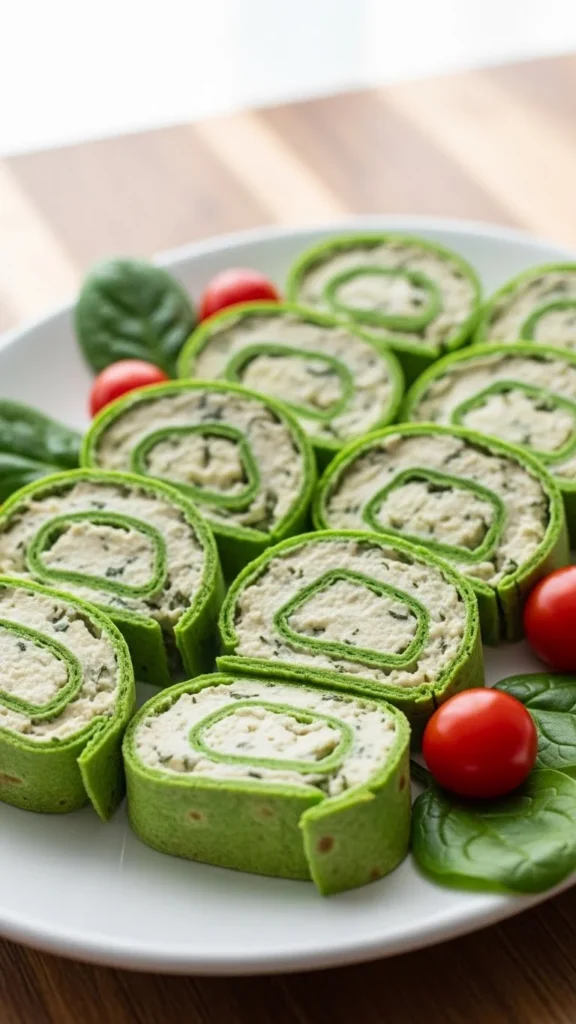 These pinwheels are colorful, soft, and easy to eat. The spinach tortillas add festive color while the cheese filling keeps them mild.