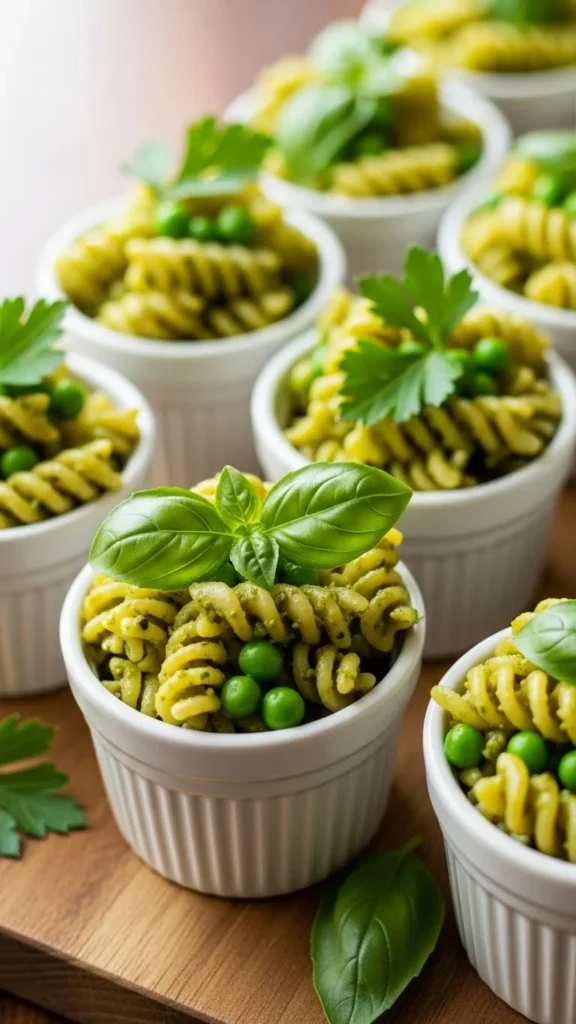 This pasta salad is filling, bright, and easy to portion. Pesto keeps the pasta moist and flavorful.